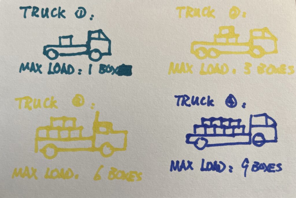 The students will identify what kind of goods need restock by identifying the provided data and choosing the correct number of trucks with the proper maximum load.