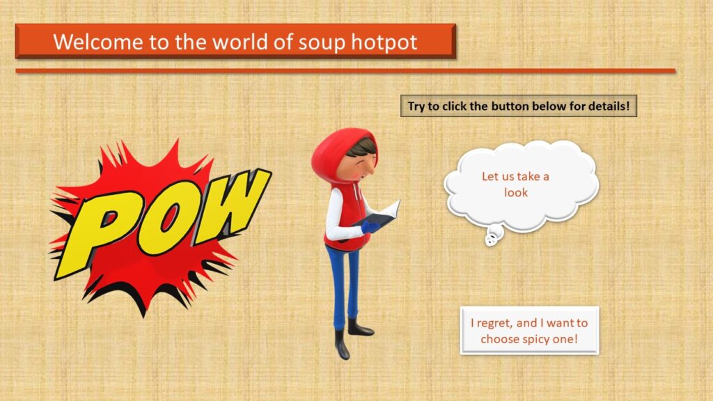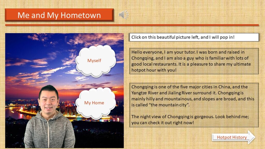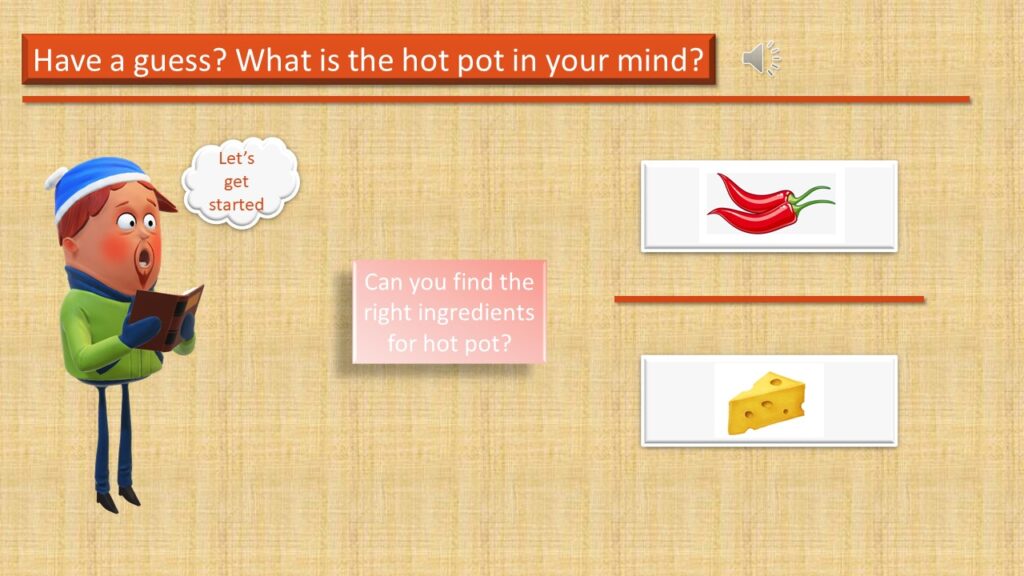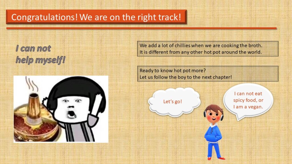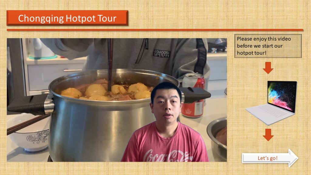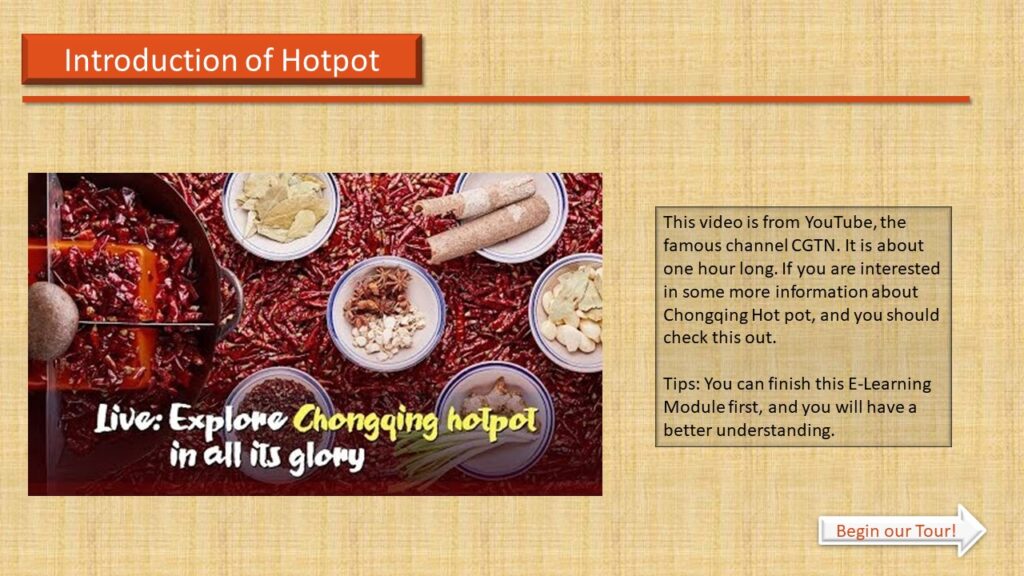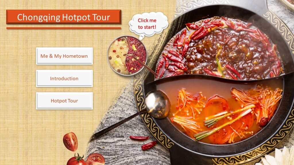 Mainly, my audiences are international students who came to my hometown to finish their further studies, and their age is from 19-23. Besides, a scenario is also one of the elements for my E-Learning module. Specifically, all students should know how to use chopsticks, and they love Chinese culture. This module provides them with a chance to see a part of the local food culture. On the one hand, after learnt from my module, they will be able to cook a perfect piece of tripe in the hotpot, which is with better texture and tastes. On the other hand, they can recognize the uniqueness of Chongqing hotpot, and finally, embrace the local culture and create their way of eating hot pot.
