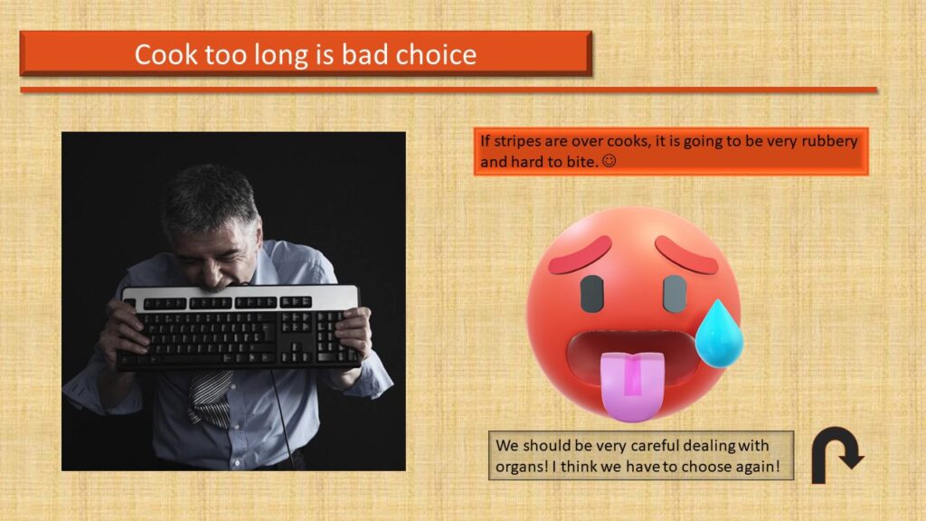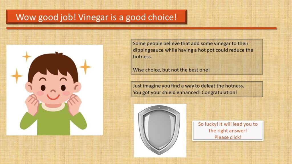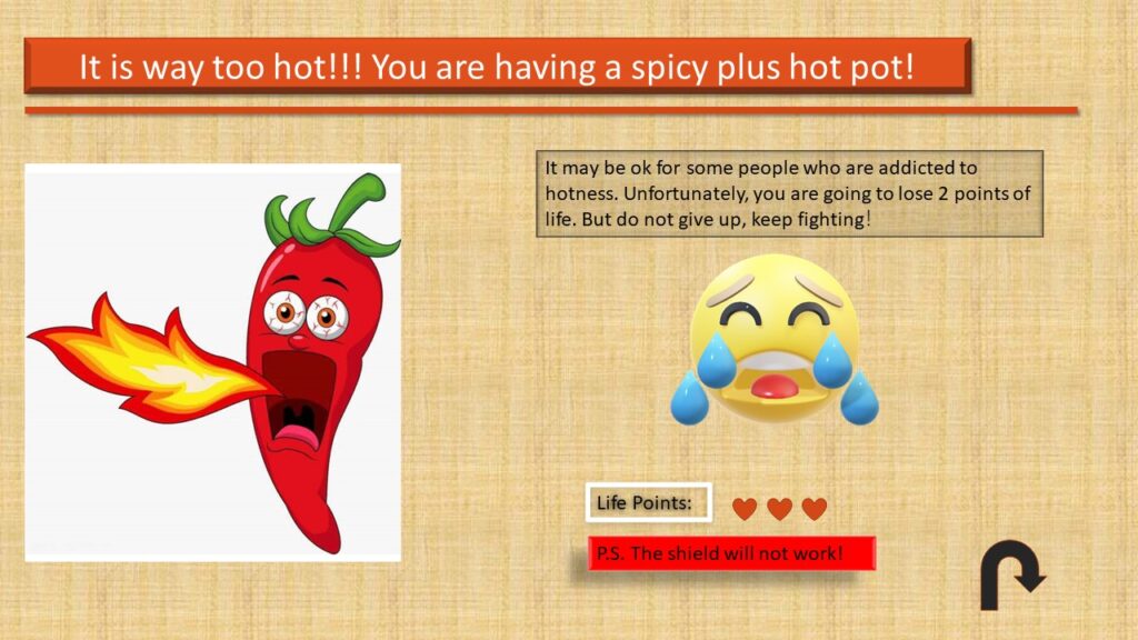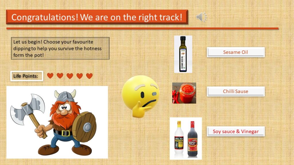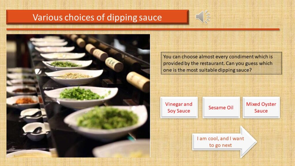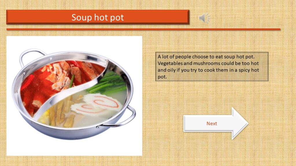 Students could study this E-Learning Module both in and outside the classroom, and they can also share the module in groups if they want to. Targeted audiences need a laptop or desktop to study this module. I do not recommend my students to use a smartphone or a pad. Some of the video and audio resources could not be compatible with android and mac OS. Therefore, with the help of technologies, each student should be able to complete my E-Learning Module alone within 5-10 minutes. However, I will send this module to their Email and tell them something they could encounter while learning. After they have done learning, I will take them to a local hot pot restaurant for practicing. Eventually, I will start a competition of cooking the most delicious piece of tripe to engage everyone.