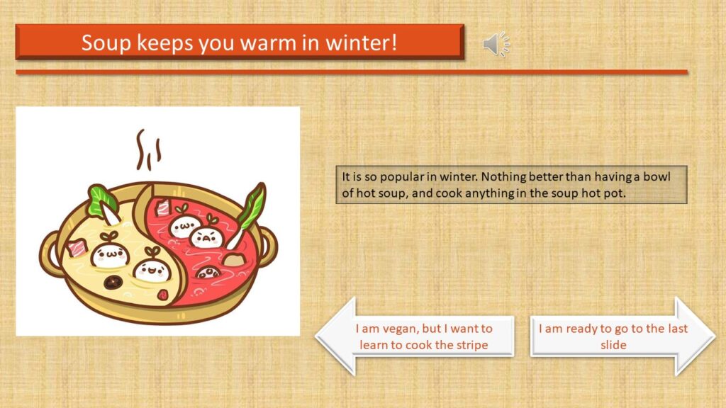 My E-Learning Module took me more than three weeks to complete, and it teaches my audiences to cook a piece of tripe in hot pot, moreover how to cook it perfectly. In this lesson of food culture, it allows viewers to follow several cooking steps, and eventually know how to deal with a piece of raw tripe. During the process, there are some alternatives for them, and these choices will lead them to the best result.